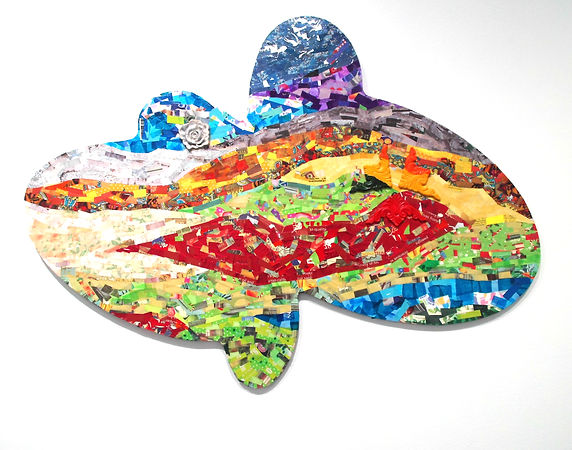 This installation was created with reused discarded materials in a mixed media collage on high quality 1/2 inch plywood with a glossy surface.